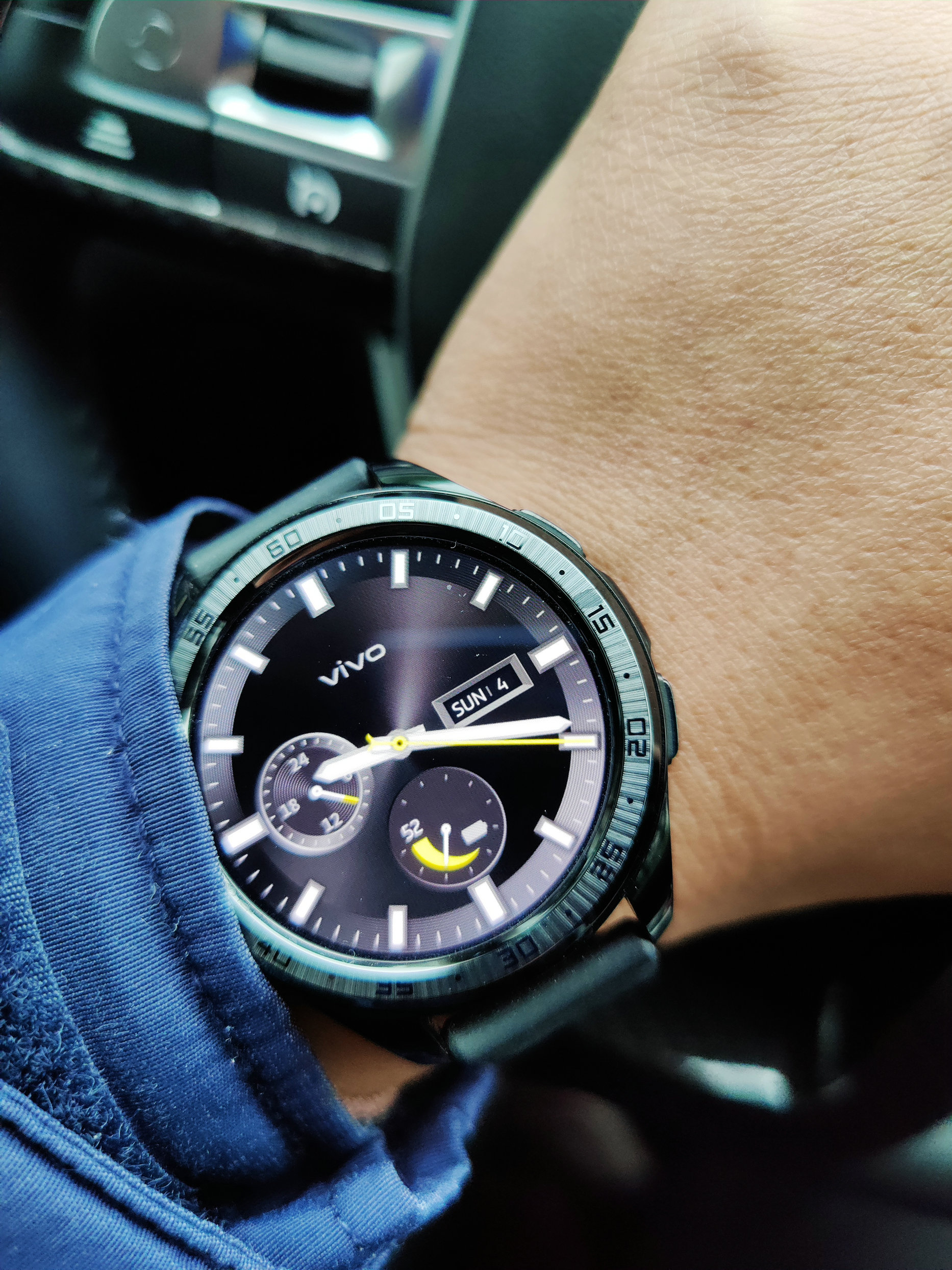 如果我们仔细对比vivo Watch的46mm和其他品牌的42mm和44mm会发现它的表盘视觉更大一些,但整体的感觉却比较的小巧。因为它的刻度设计并没有太冲击整体的设计,即使更换到简约风格的智能表盘也会更加的兼容更多的打扮风格,不拘泥于其他品牌的户外风。