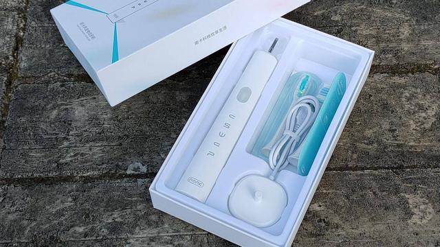对于一个资深数码爱好者,接触过的电动牙刷产品也不在少数。当我初拿到包裹的时候,就对这款包装感觉到非常似曾相识的感觉,正面包装整体布局与笔者早期用过的一款叫扉乐的可谓是姊妹篇,简约的配色给人印象深刻。