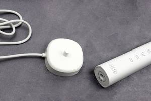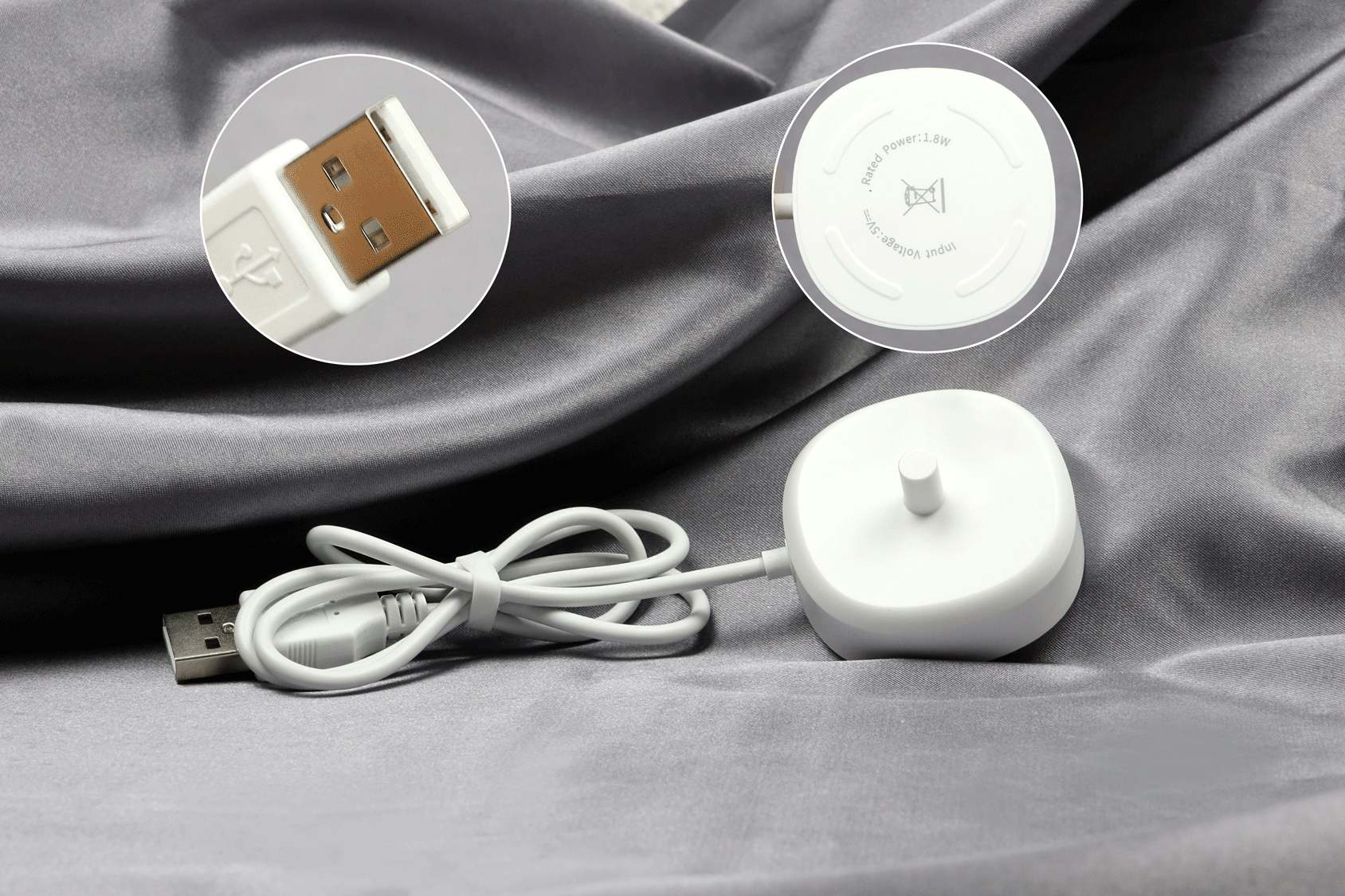 充电底座跟牙刷一样采用纯白设计,底座上有突出的“充电杆”但并没有金属触点之类的设计,这样更安全可靠。输入电压5V,额定功率为1.8W采用USB接口连接电源。