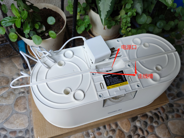 下方是电源接口以及线槽,电源采用的是DC接口,而不是选用主流的Micro-USB或者Type-C,有些遗憾。线槽可以将线嵌入其中,保证底部的平坦。因为电源接口在底部,所以底部的防水显得尤其重要,否则很容易短路。在实际使用过程中也发现电源线有点短,个人觉得2米左右较为合适。