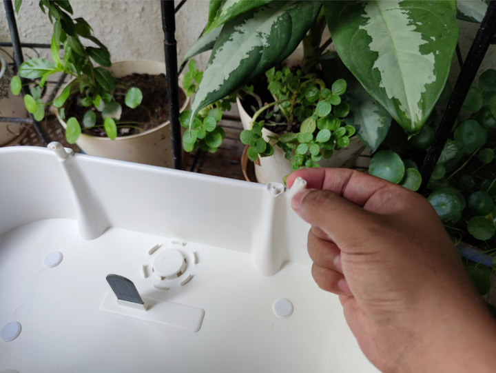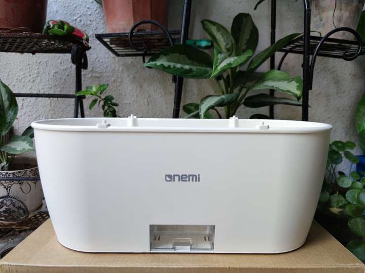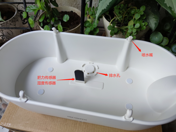 种植机采用椭圆柱形设计,纯白色,PC材质,看上去很有质感,400*190*160cm的尺寸也比较方便挪动。最上方是四个喷水孔,赠送的喷嘴儿就是插在这上面的,喷嘴有一定的角度,插上以后可以调节方向,以便浇水。