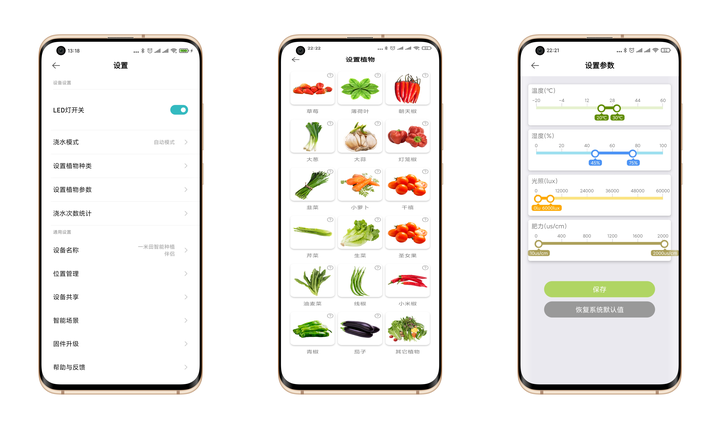 APP中还可以选择种植的产品,并设置相应的参数,可以更好地给植物提供最好的条件。而且还能设置手动浇水还是自动浇水,以及浇水的次数统计信息等。
