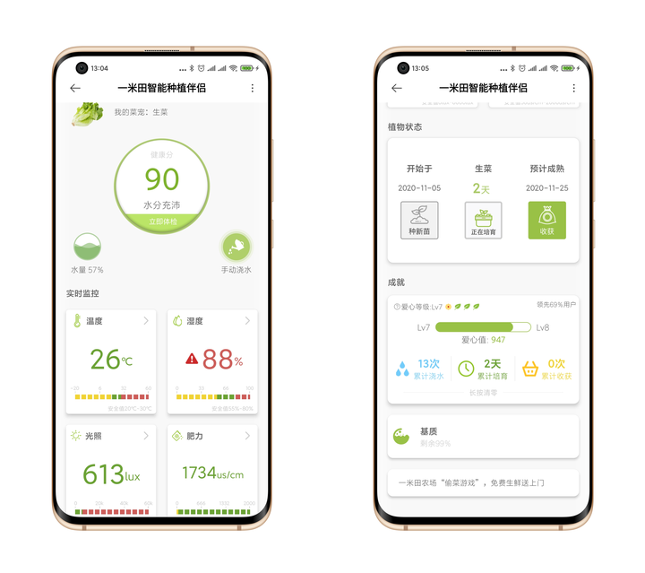 通过米家APP可以实现远程查看植物情况,选择种植的蔬菜、体检、水量、远程浇水;实时的温度、湿度光照以及肥力;目前植物的状态,包括开始时间,种植天数,预计成熟时间等,成熟后选择收获就可以清零全部数据。同时会增加自己的种菜经验并获得成就,收获一次确实会有成就感。