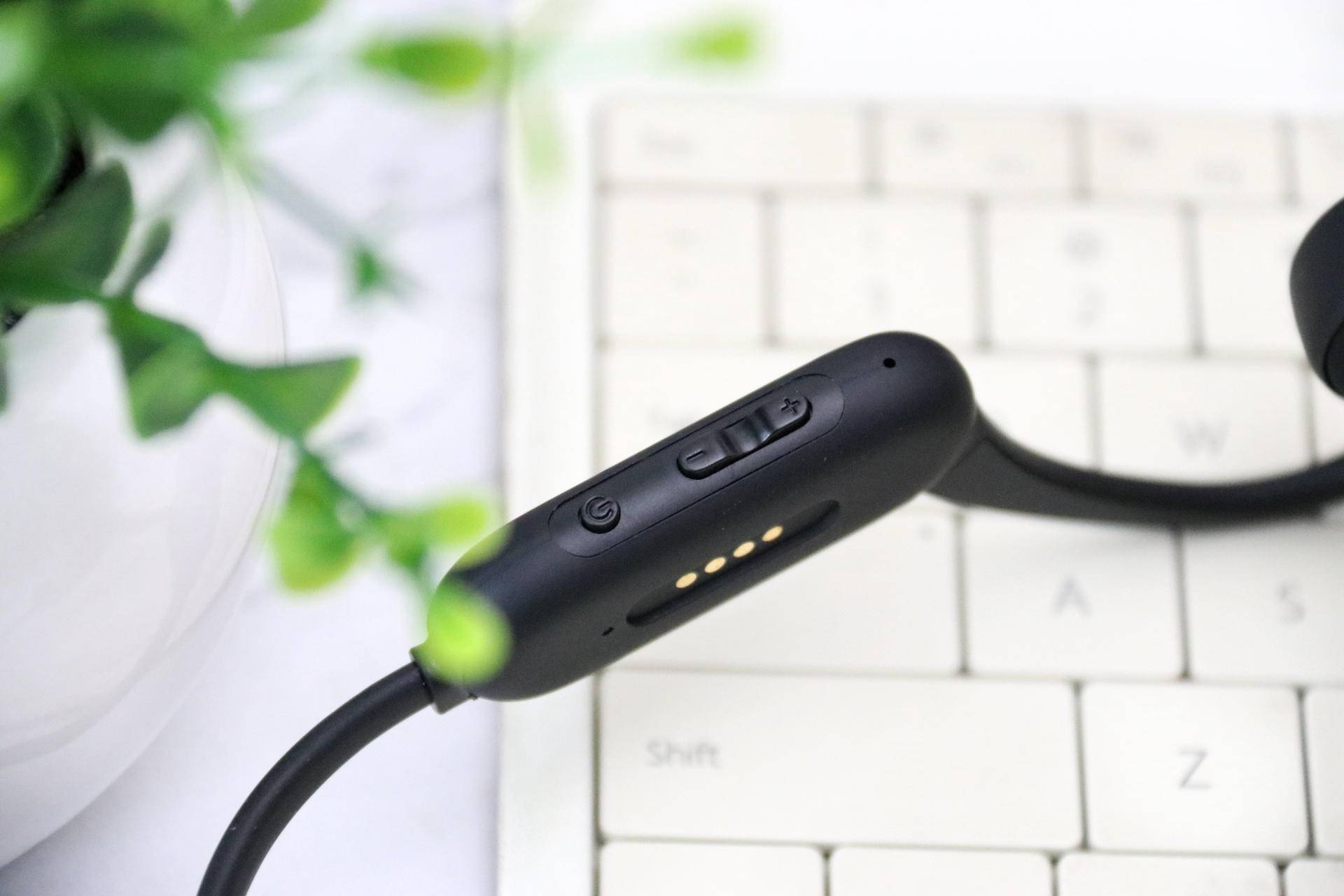 南卡NANK骨传导耳机Runner Pro上有三个控制按键,分别为音量+/-键、电源键。音量调节键和电源键分别位于两侧,且按键进行镂空设计,有利于单手盲操作。除音量调节外,耳机上按键还可进行切歌、唤醒语音助手、接听电话等,各种操控一应俱全。