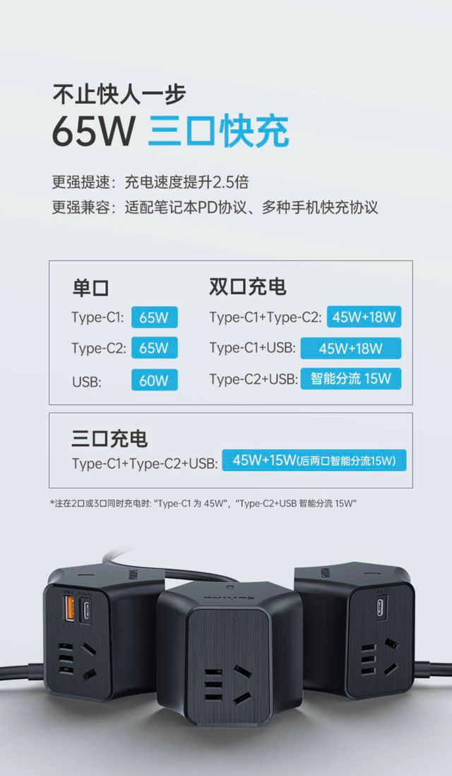 USB-A输出最大为65W,最小为22.5W。