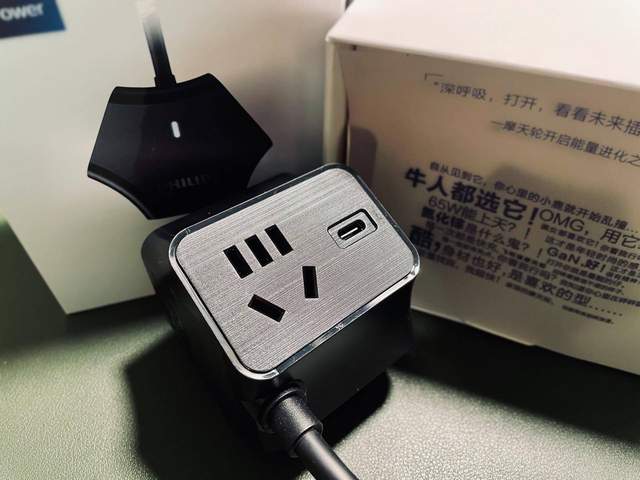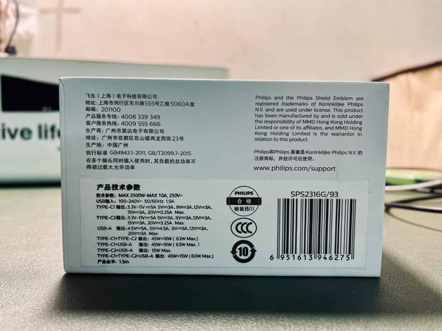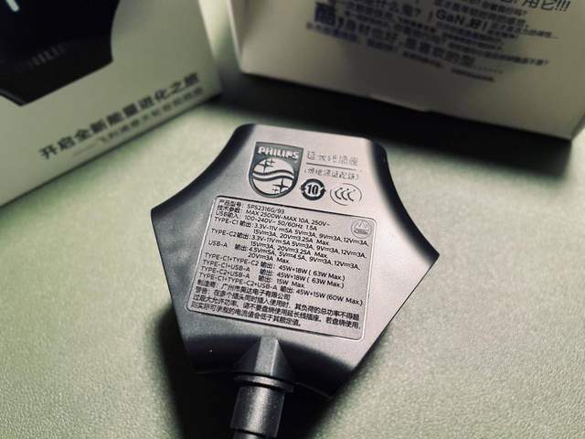 包装正面第一眼看到的是一个六边形的电源插座产品渲染图,左上角是飞利浦家庭电源的标识logo,下方则是这款产品的口号——开启全新能量进化之旅以及他的产品名称。包装的侧边印有一些主打的卖点例如支持最大输出65W,儿童安全防护等,底部则提供了产品的技术参数以及厂家的服务信息。