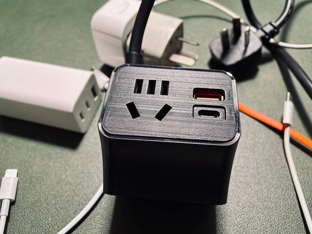 A面有一个二三相插孔,一个USB-A接口,一个type-c接口,B面由一个type-c接口,一个二三相插孔组成,C面则只有一个二三相插孔,总体是一个3+2+1的六孔组合。