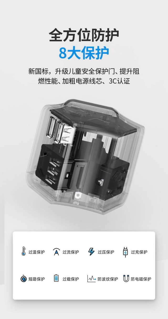 在安全保护方面,也下足功夫。除了我们常见的过温,过流,过压,过充保护外,还有短路保护,过载保护,防波纹保护以及防电磁保护,真正做到了阻燃性能儿童安全保护能力的双提升。