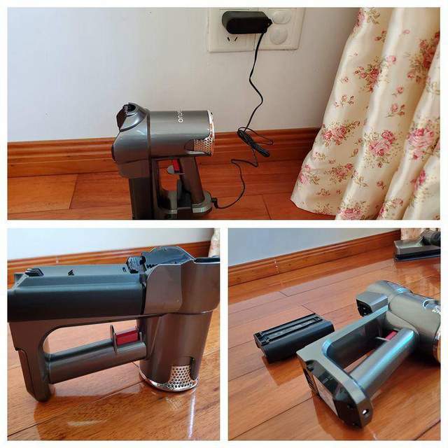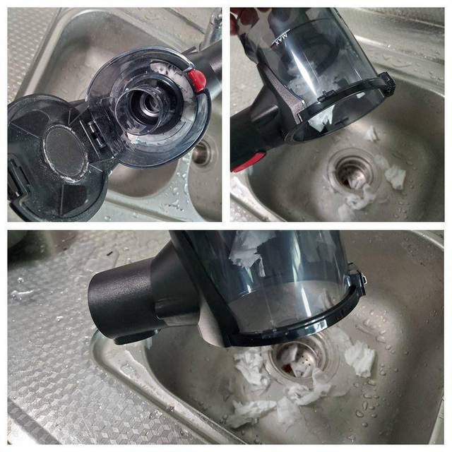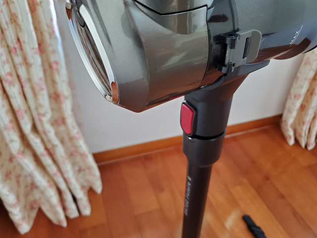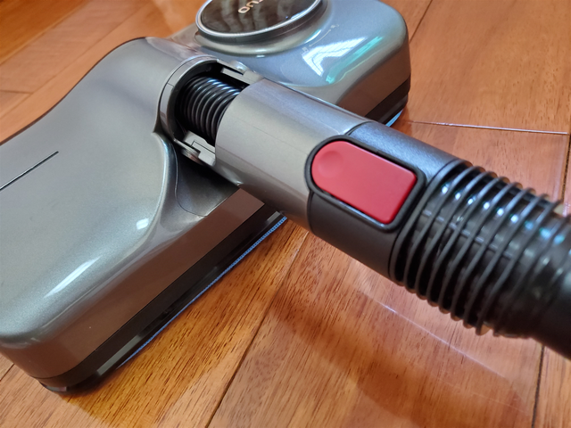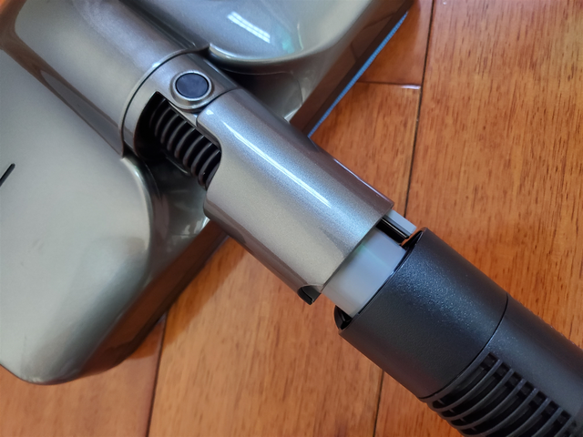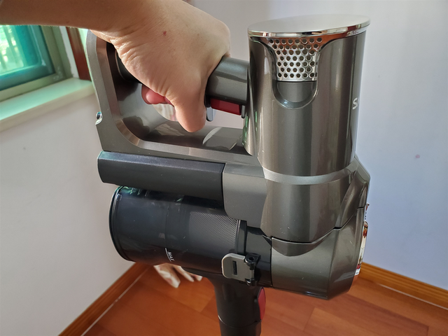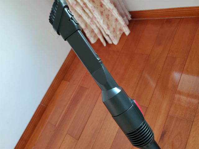 说到这个产品的安装,我也来做个介绍,只需要按住红色卡扣,吸尘杆和清洁头依次对准安装即可。非常快,几乎不需要耗费什么力气,男女皆可轻松上手。