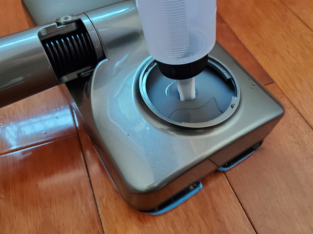 将清洁头翻过来,可以看到有两块蓝色的拖布和一个喷头。微锯齿前布快速干擦,去除浮尘,软绒毛后布湿拖清洁,处理顽固污渍。喷水头设计在中部,做到了干湿分离,拖地时保持灰尘、毛发等垃圾的干爽状态,更容易被带走。