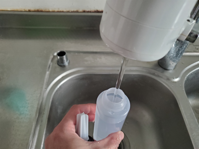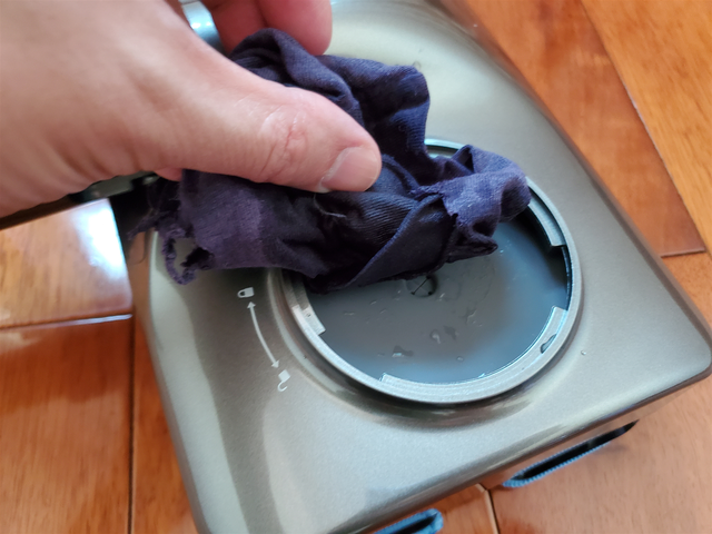 配套的注水壶是用来给水箱加水使用的,水箱设计很人性化,只需要按照机身示意的标志旋转即可打开、关闭,将注水壶嘴深入硅胶圈内即可为水箱注水了。一次性可注入100ml的水量,足够湿拖完整个家。