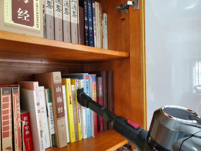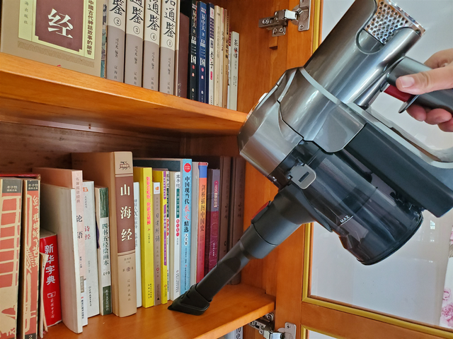 洒拖F6吸拖一体机除了可以清理各种硬质地面,安装配带的二合一扁吸毛刷,还可对墙壁、家具、电脑键盘、窗台、汽车内部等犄角旮旯进行清理。连我的书柜平常不怎么清理的角落都能搞定,无需频繁更换其他清洁工具,满足用户更多需求,十分贴心。