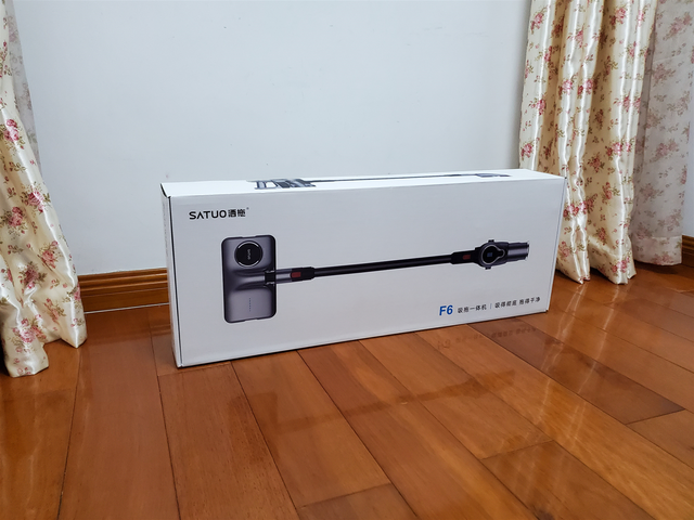 收到洒拖F6家用无线电动拖把,我就高兴拿回了家,外包装盒非常大气,简约,洒拖品牌在左上方,右下方是F6型号吸拖一体机,宣传语:吸得彻底、拖得干净,产品图在正中间位置。