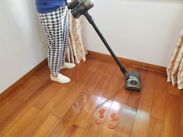 它共有两档吸力,可以根据不同需求调控档位。我要处理一下地板上的番茄汁,也不知道到底效果怎么样,一起来瞧瞧。