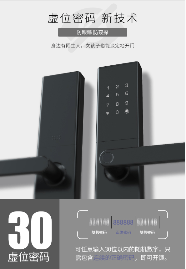 密码开锁作为次常用的开门方式,小益E205T支持6位密码开门,这也是大部分智能锁的一大功能,别具特色的是支持多达30位虚密码开门,在6位密码前后任意输入乱码,仍然可以打开家门。有效防止他人通过指纹痕迹破解密码,即使边上有人,无需遮掩,就能达到防窥视的效果。