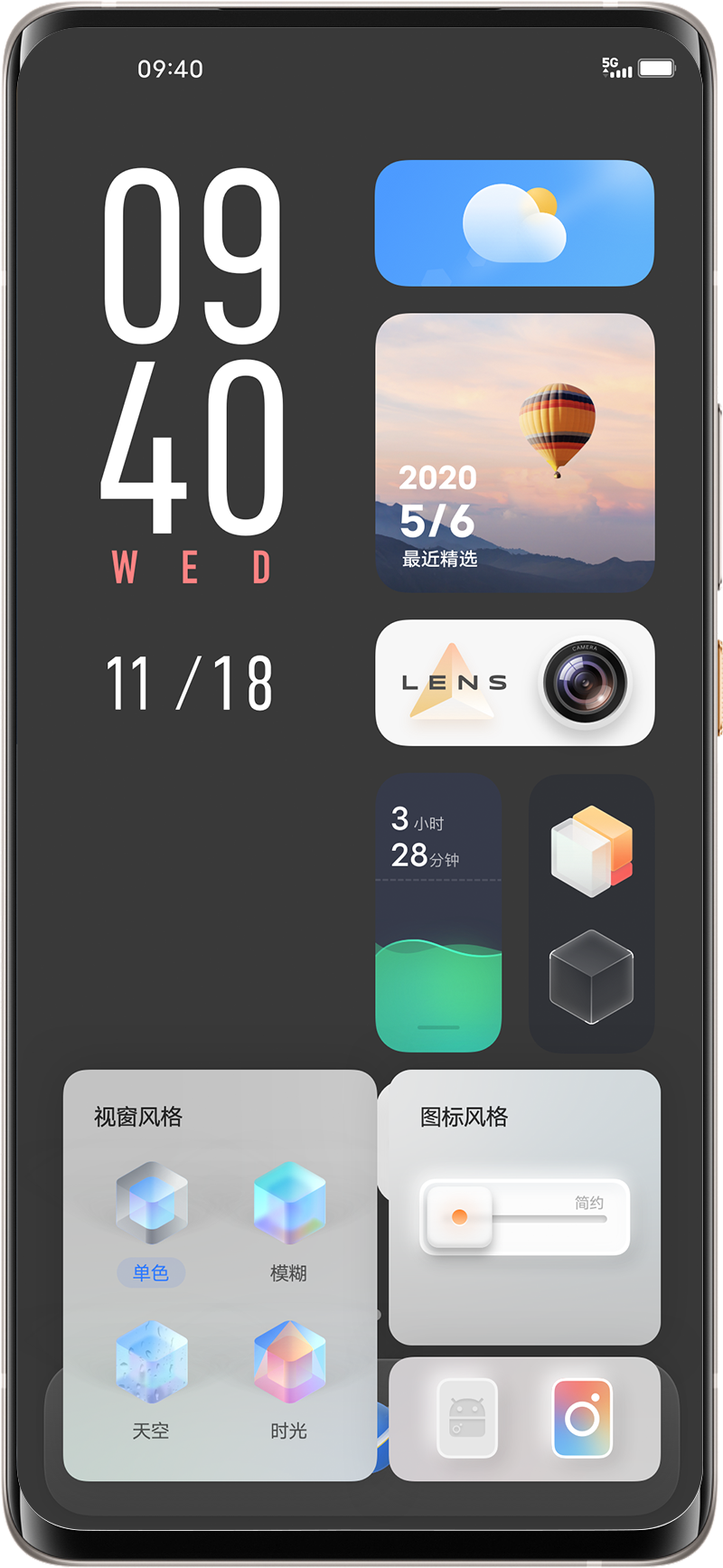 OriginOS推出了“变形器”功能,提供不同的视窗风格和图标风格,满足不同用户群体的审美需求。用户简单选择,就能拥有个性化的OriginOS创新桌面,并且可以“一键穿越”,回归传统桌面。差异化的场景和视觉风格能够适应不同的用户群体以及不同的场合,彰显个性。