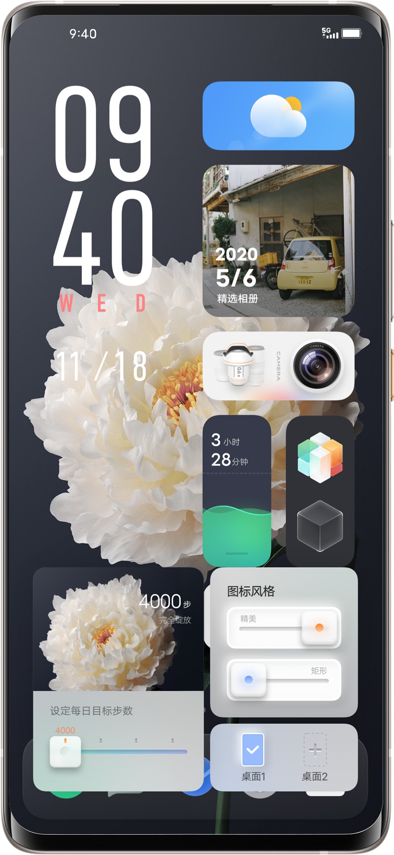 大家往往认为,手里的屏幕里只有冰冷的功能和信息,但OriginOS把生活的温度和感知带进了屏幕。“原景视窗”成为了手机和现实世界之间搭的桥梁,在不影响主屏操作的情况下,用户可以感受到与外界同步的天气和环境变化。举个生动的例子,在日出到日落的16个场景内,用户可以清晰感知到不同时间的环境亮度、光线和色温。不仅于此,用户也可以设置自己每天的目标步数,每走一步,花朵就多绽放一步。OriginOS所致力于的,便是将日常生活中的无意识行为,转变成为了用户可以感知的美感。
