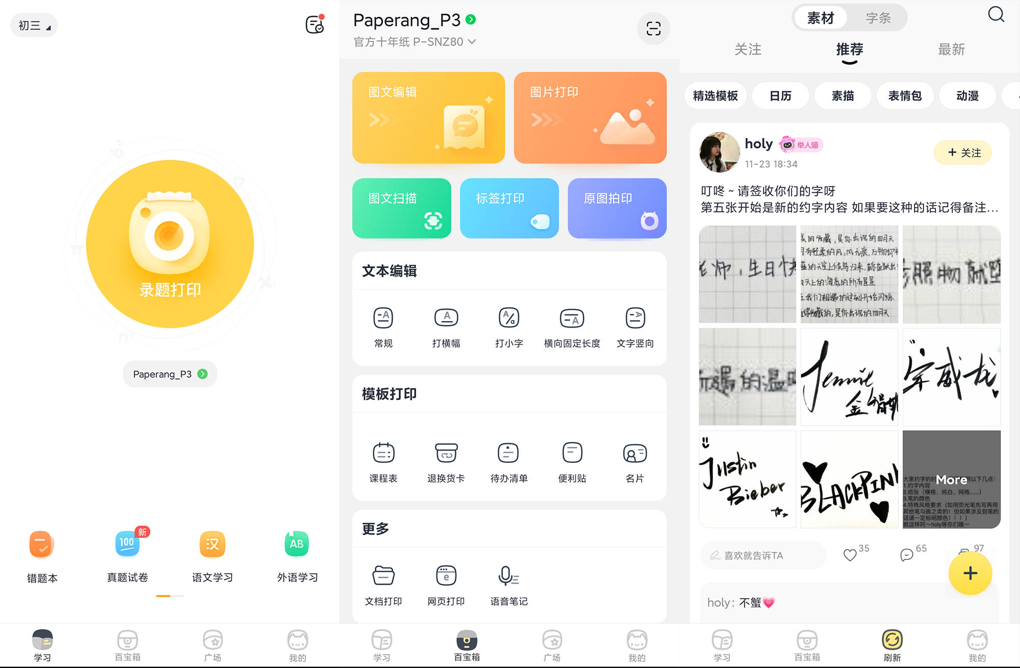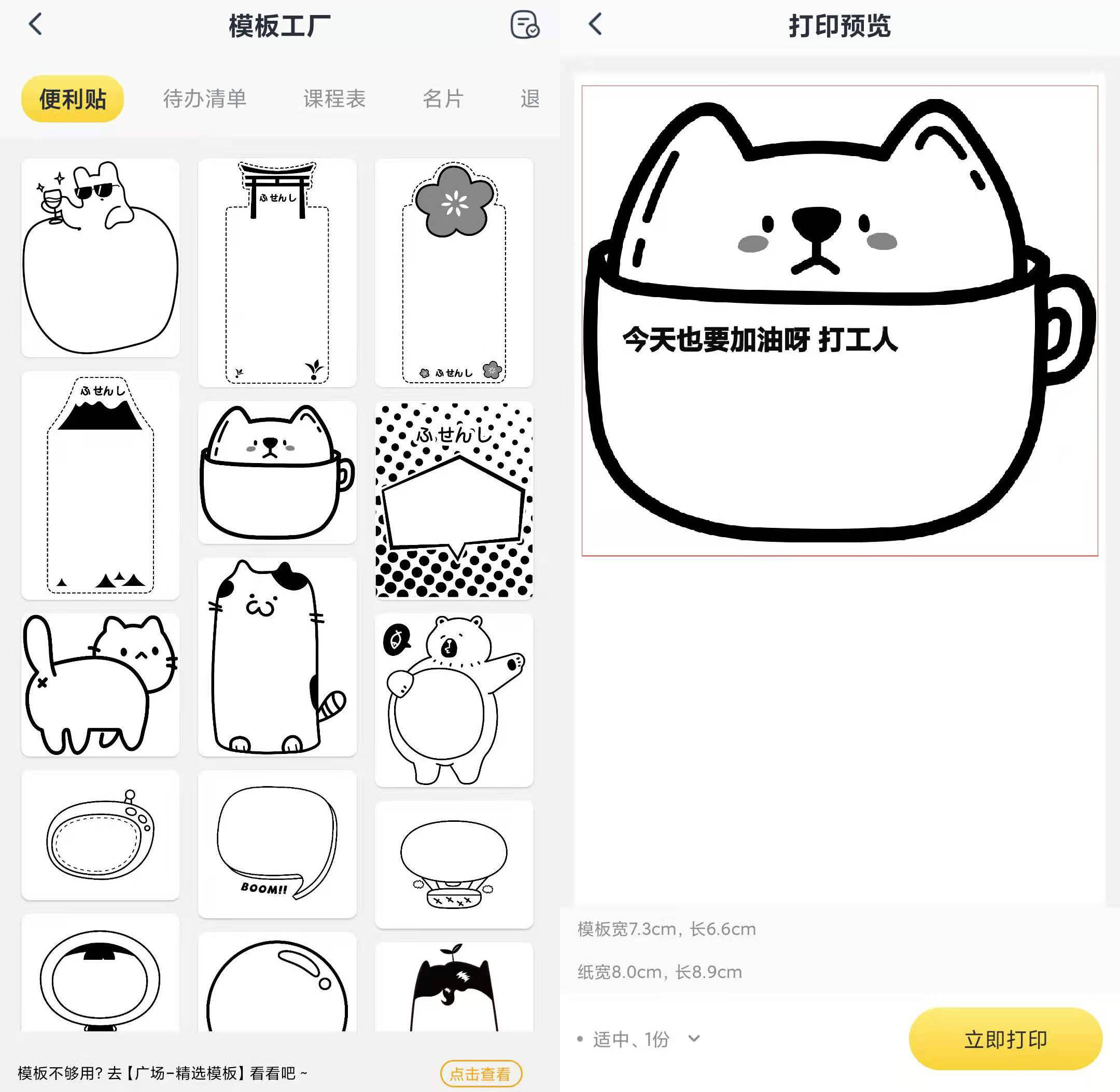 在百宝箱界面,喵喵机提供了多种趣味的打印方式,不仅仅可以打印学习材料,还能打印课程表、图文、便利贴、横幅等,趣味又实用。