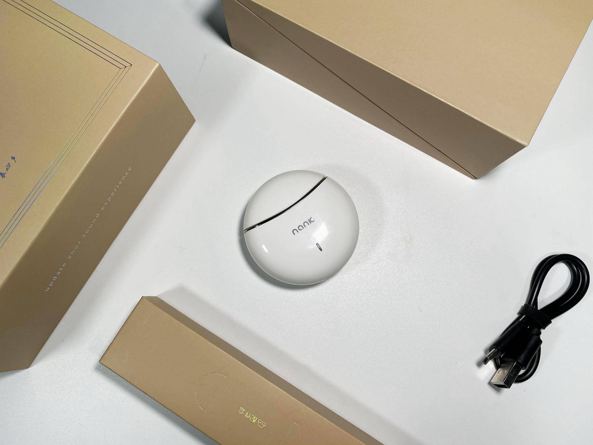 正面为Nank logo和充电指示灯,最下方为type-C充电口,七月一直讲配备type-C接口的耳机才像是2020年的真无线耳机,南卡将充电口触点也打磨成和机身外壳相应的弧线,既没有让接口突出机身也没有形成一个凹槽,可以看出南卡对于细节的用心。
