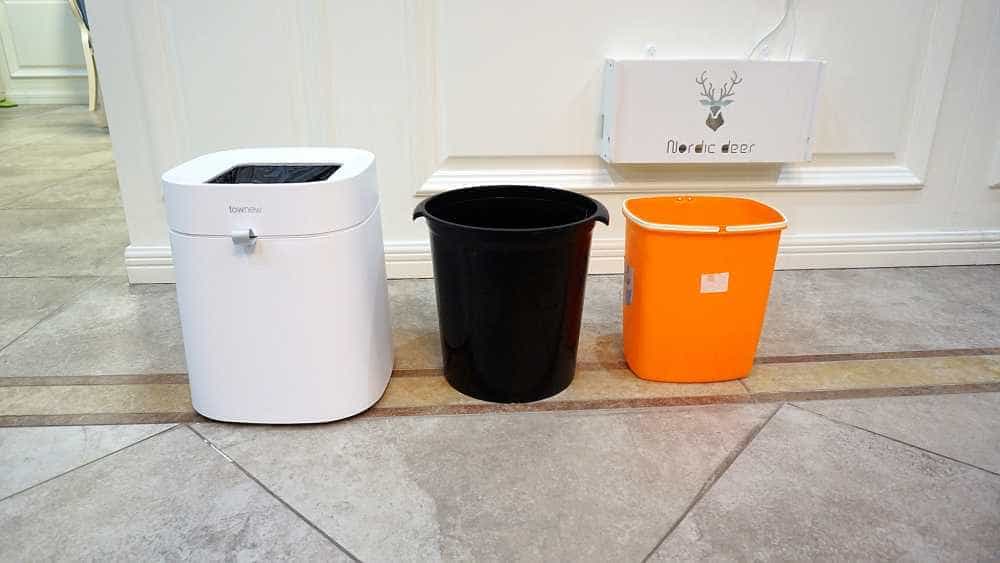 这一排就是家里在用的垃圾桶,如果从颜值上来说,当然是拓牛T Air Lite更胜一筹,而且容量上也要大很多。如果作为客厅主咖担当,就必定是拓牛了。那和普通垃圾桶比较,又会有什么不同呢?