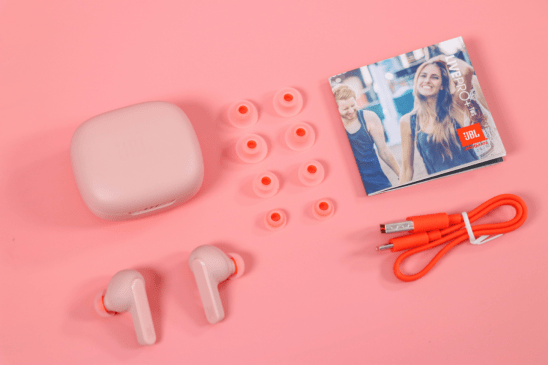 拆开后,就能看到包括JBL LIVE PRO+TWS本体在内的“全家福”了,其中有耳机和充电仓的颜色是一体的,除了本身有一对耳帽外,还附赠了四对不同规格的耳帽,用户可根据耳廓大小自行更换;充电线为主流的Type-C口,非常方便。