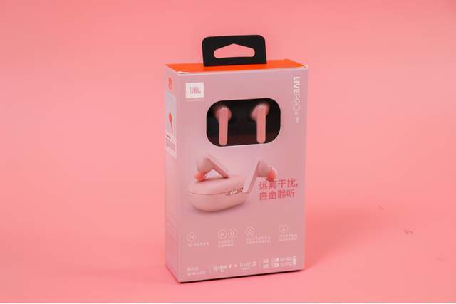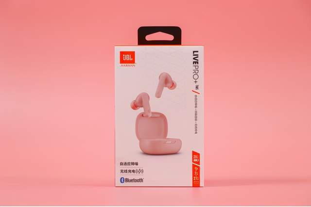 作为数码从业者,市面上的TWS耳机基本用了一个遍,普遍都是黑白灰的配色,这次想要不一样的感觉,入手了JBL LIVE Pro+的粉色款。包装正面印有耳机的样子,左上方有哈曼和JBL的标识,意味着这款耳机在音质方面会有不错的表现。底部则是另外在底部和右侧写有这款耳机的诸多亮点,比如自适应降噪、无线充电、双链路连接等,后续会对这些功能进行体验。