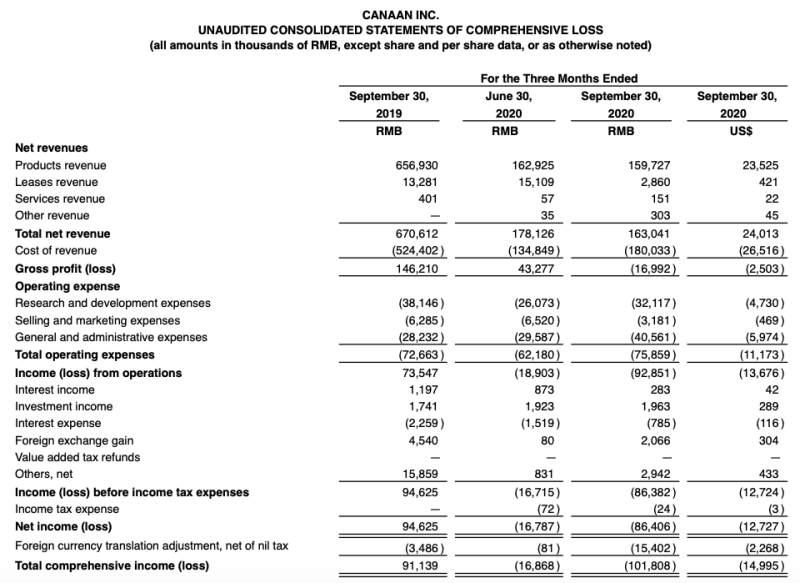 11月30日,比特币矿机生产商嘉楠科技(NASDAQ:CAN)发布2020年未经审计的三季报。第三季度,嘉楠科技净收入为1.63亿,同比下降75.7%,环比下降8.5%;净亏损录得8640万,去年同期数据为净利润9460万,亏损环比扩大4倍。