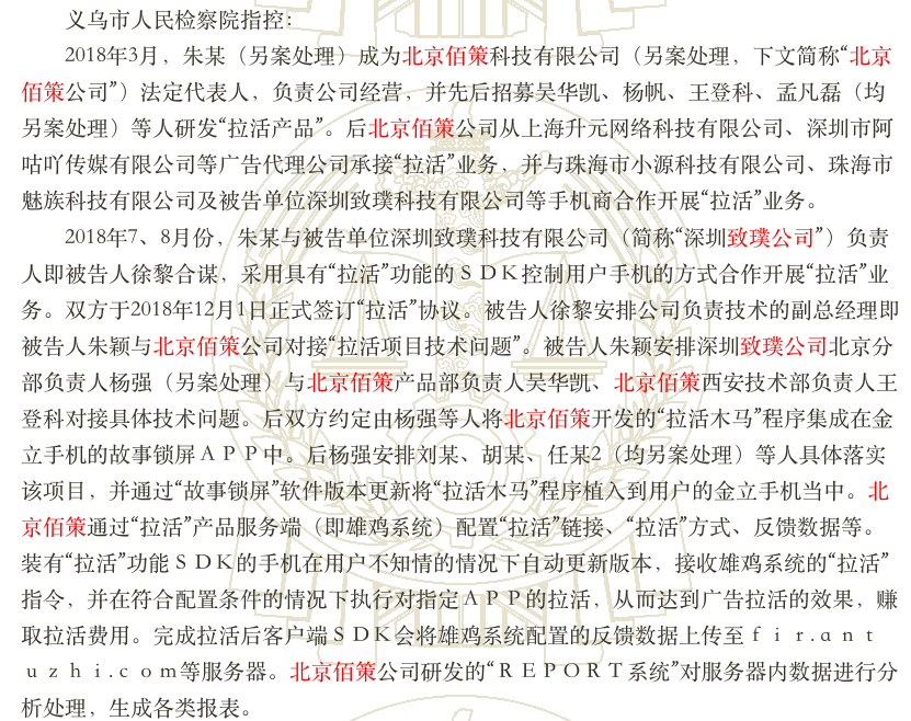 义乌市人民检察院指控称,2018年3月,被另案处理的北京佰策创始人、法人代表朱翼鹏招募相关人员研发“拉活产品”。