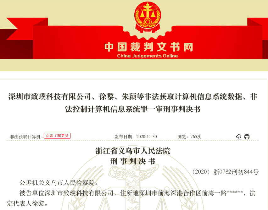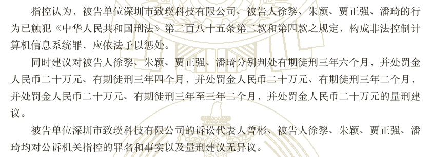 判决文件显示,深圳致璞科技有限公司(下称:致璞公司)负责人徐黎、负责技术的副总经理朱颖等人的行为触犯相关规定,构成非法控制计算机信息系统罪,建议对被告人徐黎、朱颖分别判处有期徒刑三年六个月,并处罚金人民币二十万元、有期徒刑三年四个月,并处罚金人民币二十万元。