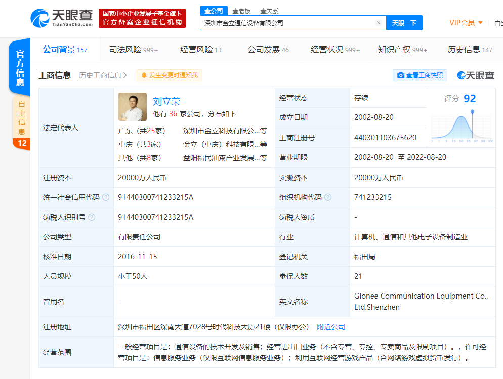 天眼查APP信息显示,金立运营主体深圳市金立通信设备有限公司成立于2002年8月,法定代表人为刘立荣,注册资本2亿人民币,经营范围包括通信设备的技术开发及销售;经营进出口业务等。天眼查App股东信息显示,该公司第一大股东为刘立荣,持股比例41.4%。