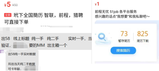 在闲鱼、QQ群等平台,有卖家低价出售各平台简历,“58纯一手3.5,纯二1.5,当天二手的4毛”、“智联实时一手3块”,多位卖家向雷达财经表示。