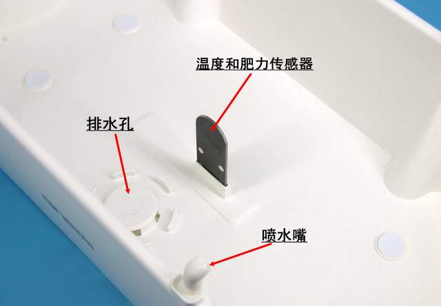 从正面可以看到一米田的logo,在下方分别是温度传感器,光照传感器和指示灯。背面有储水盒,侧边有加水口。底部的设计还是很用心的,中间的一个长条凹槽,电源线可以收纳在凹槽内,不会影响到日常的使用。