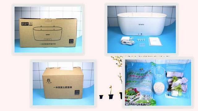 从包装上可以看出,这款一米田智能种植伴侣可以在小米有品上购买,包装上也透漏出很多产品的功能特点,接入了米家,可以使用小爱控制等。在包装内包含了:一米田智能种植伴侣,电源线,四个喷水嘴卡针和使用说明书。还附赠一箱苗土肥套装,里面包含了一袋肥料,菜苗,量杯和一盒珍珠岩。