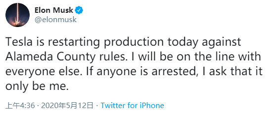马斯克推特让众多吃瓜群众印象深刻:“特斯拉今天违反阿拉米达县的规定重新开始生产。我将会与所有员工站在一起面对风险。如果有人被捕,我要求只抓我一个。”更具争议的是,马斯克称就地庇护令“将人们强行囚禁在家中,违反了宪法权利”,甚至称政府的行为是“法西斯主义”。