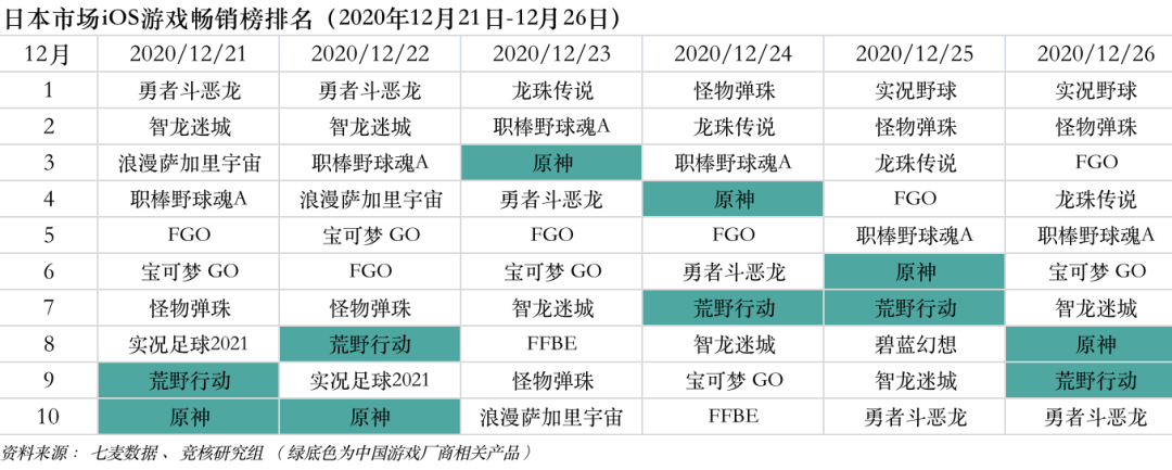 日本2020年12月21日—12月26日IOS游戏类畅销榜中,除了常年盘踞日本市场的网易《荒野行动》外,米哈游《原神》最高排名TOP3。