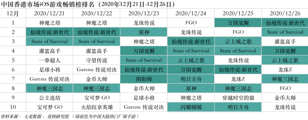 中国香港市场2020年12月21日—12月26日IOS游戏类畅销榜中,字节跳动、FunPlus、昆仑万维、米哈游、莉莉丝、网易游戏、三七互娱、鹰角网络、叠纸网络等厂商旗下产品均打入香港IOS游戏畅销榜TOP10内。