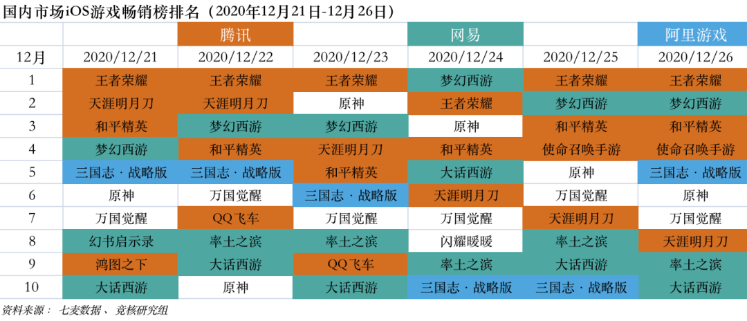 国内市场2020年12月21日—12月26日IOS游戏类畅销榜中,腾讯新作强势杀入TOP5内,网易老游凭借活动运营再次登顶畅销榜。