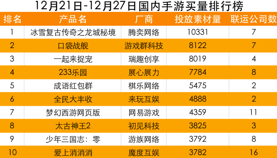 从整体大盘来看,12月21日—12月27日休闲手游占据买量榜TOP10一半位置。