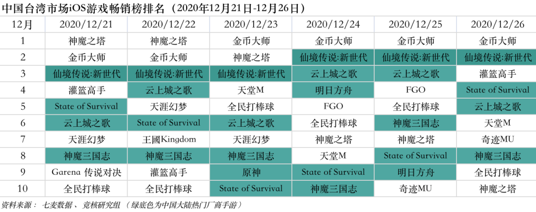 中国台湾市场2020年12月21日—12月26日游戏类畅销榜中,《仙境传说:新世代》受《神魔之塔》和《金币大师》冲击,基本稳定在台湾IOS游戏畅销榜TOP3内。