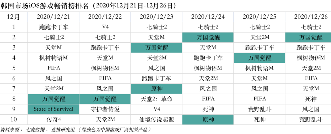 2020年12月21日—12月26韩国IOS游戏类畅销榜中莉莉丝、米哈游、FunPlus等厂商均有游戏上榜。