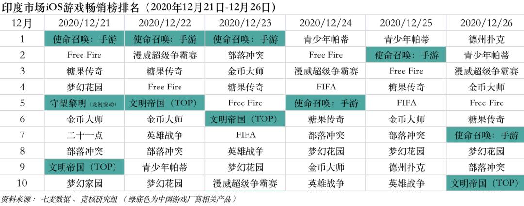 2020年12月21日—12月26日印度IOS游戏类畅销榜中,腾讯、龙创悦动、TOP GAMES等厂商旗下手游进入Top10榜单。