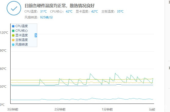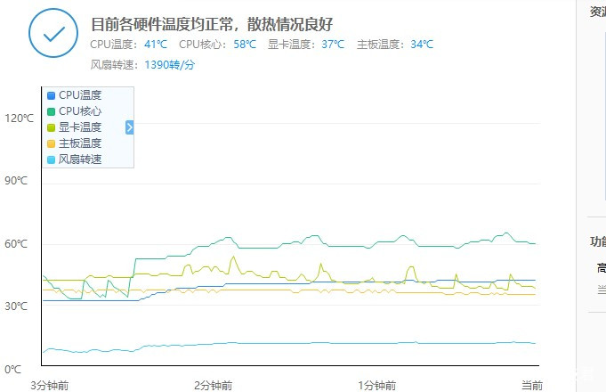 在鲁大师温测试中,一开始可以保持在30度左右,在压力测试下CPU保持在58度,我认为这个散热能力还算不错!