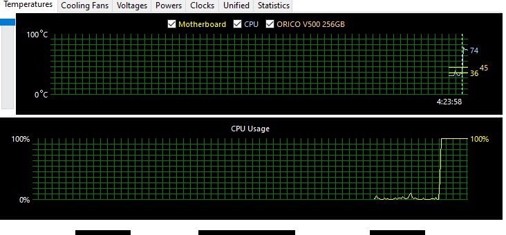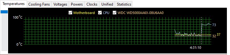 可能有些人觉得鲁大师不专业,那我们换AD64 在AD64中刚开始5分钟为45度,最高温度为73度。怎么说成绩还是可以的,稳稳的压住!