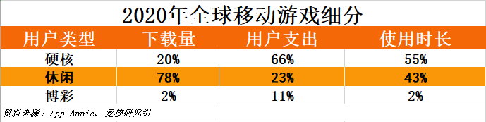 App Annie在报告中指出,2020年全球移动游戏中,休闲游戏在下载量排行榜中以78%的比例一骑绝尘,硬核游戏、博彩游戏仅占20%和2%。