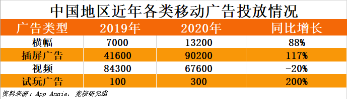 再细化分析即可发现,中国移动市场2019-2020的广告投放中,横幅、插屏广告、试玩广告均出现了不同程度的增长。