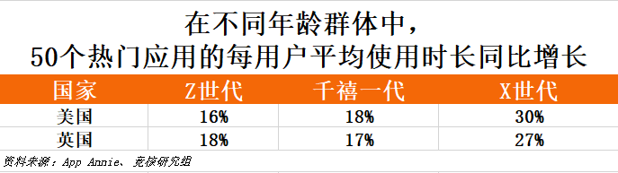 尤其是“X世代(婴儿潮一代)”,他们代表着45岁以上的群体。在2020年,美国“X世代”用户平均使用移动设备时长同比增长达到30%,远高于“Z世代”和“千禧一代”。英国同样如此。