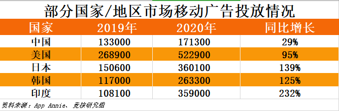 可以从中看出,印度市场移动广告增量尤为突出,美国、日本、韩国也均有一倍左右的增量。中国市场的增长相对来说偏慢,且基数偏低。