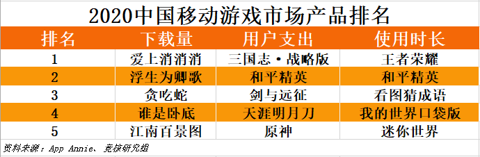 使用时长方面毫不意外地被《王者荣耀》《和平精英》包揽前两名,其中《王者荣耀》成功在2020年突破1亿DAU。