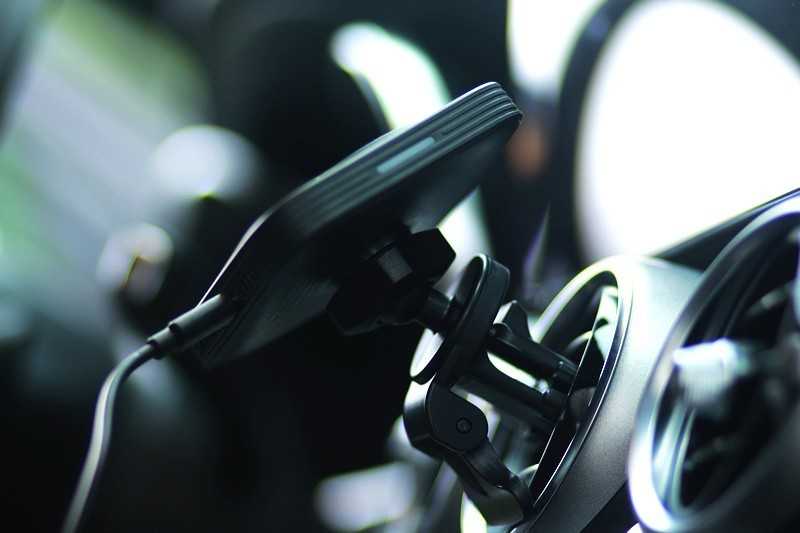 将亿色无线充电支架安装好背夹后,通过出风口选择档位固定好,连接上车载电源。手机无论是直放,竖放手机都不会掉落,其吸力强大,就算颠簸也不会掉落。