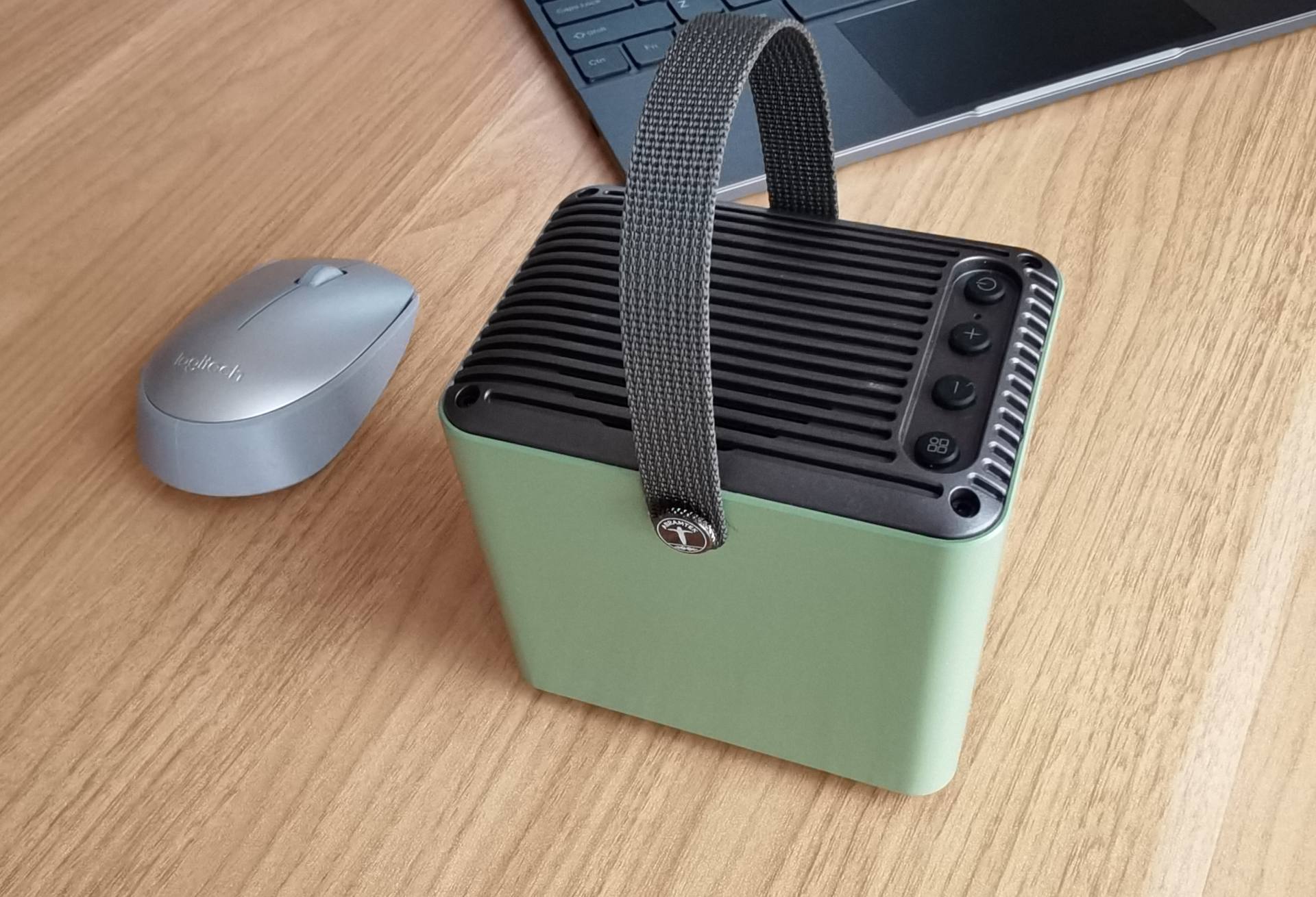 金刚6mini便携蓝牙音箱外观设计为硬朗化风格,黑色的扩音格栅和森绿色的金属外壳相碰撞,硬朗画风里隐藏些许复古的风格特色。加厚的金属材质与磨砂表面处理让产品既显硬朗又不失手感,体积为105*103*75mm,重量为650克,相比上一代金刚6,体积小了近1/3,便携性真的非常高。平时带出门只需要把它塞进包包里就行。